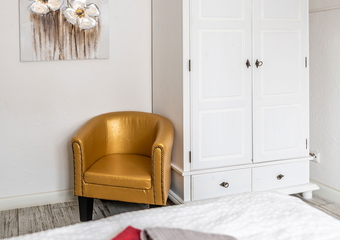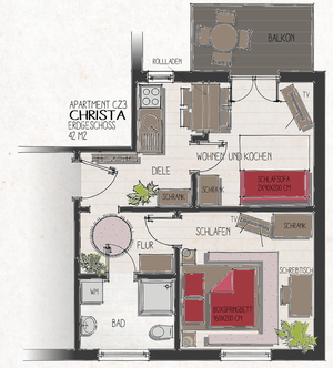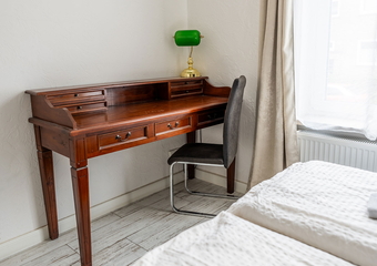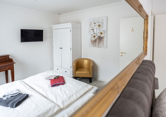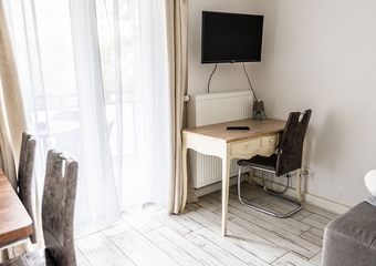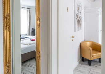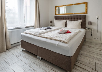 The apartment is located in the annex to Villa Backstein and is around 400 metres from the main building. The apartment is 42 m² and has 1 bedroom with a double bed, 1 living room with a sofa bed and a kitchenette, as well as a bathroom with shower. We would be happy to provide a travel cot and high chair for our young guests if desired. The apartment is non-smoking. Your pet is very welcome. You can use one parking space by the main building on Obotritenring free of charge.