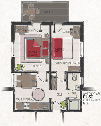The apartment is located in the annex to Villa Backstein and is around 400 metres from the main building. The apartment is 42 m² and has 1 bedroom with a double bed, 1 living room with a sofa bed and a kitchenette, as well as a bathroom with shower. We would be happy to provide a travel cot and high chair for our young guests if desired. The apartment is non-smoking. Your pet is very welcome. You can use one parking space by the main building on Obotritenring free of charge.